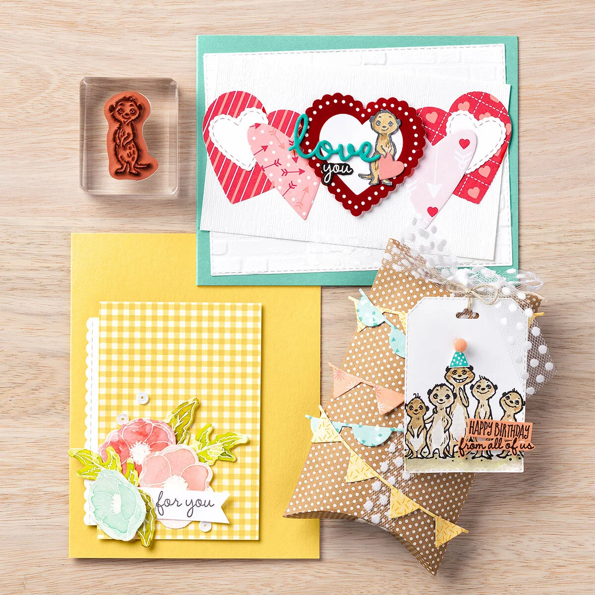 The Gang’s All Meer Stamp Set is a fun one to bring out the smiles and you can show its versatility with our projects here. To create a darling valentine, we paired the set with From My Heart Specialty Designer Series Paper, the Heart Punch Pack, and the Stitched Be Mine Dies. The beautiful For You card shows the opportunity to pair sentiments with embellishments, in this case, the Peaceful Poppies Elements. And on our cute birthday box, we combined the stamp set with the Bonanza Dies. There are so many ways to share creativity—and Sale-A-Bration!