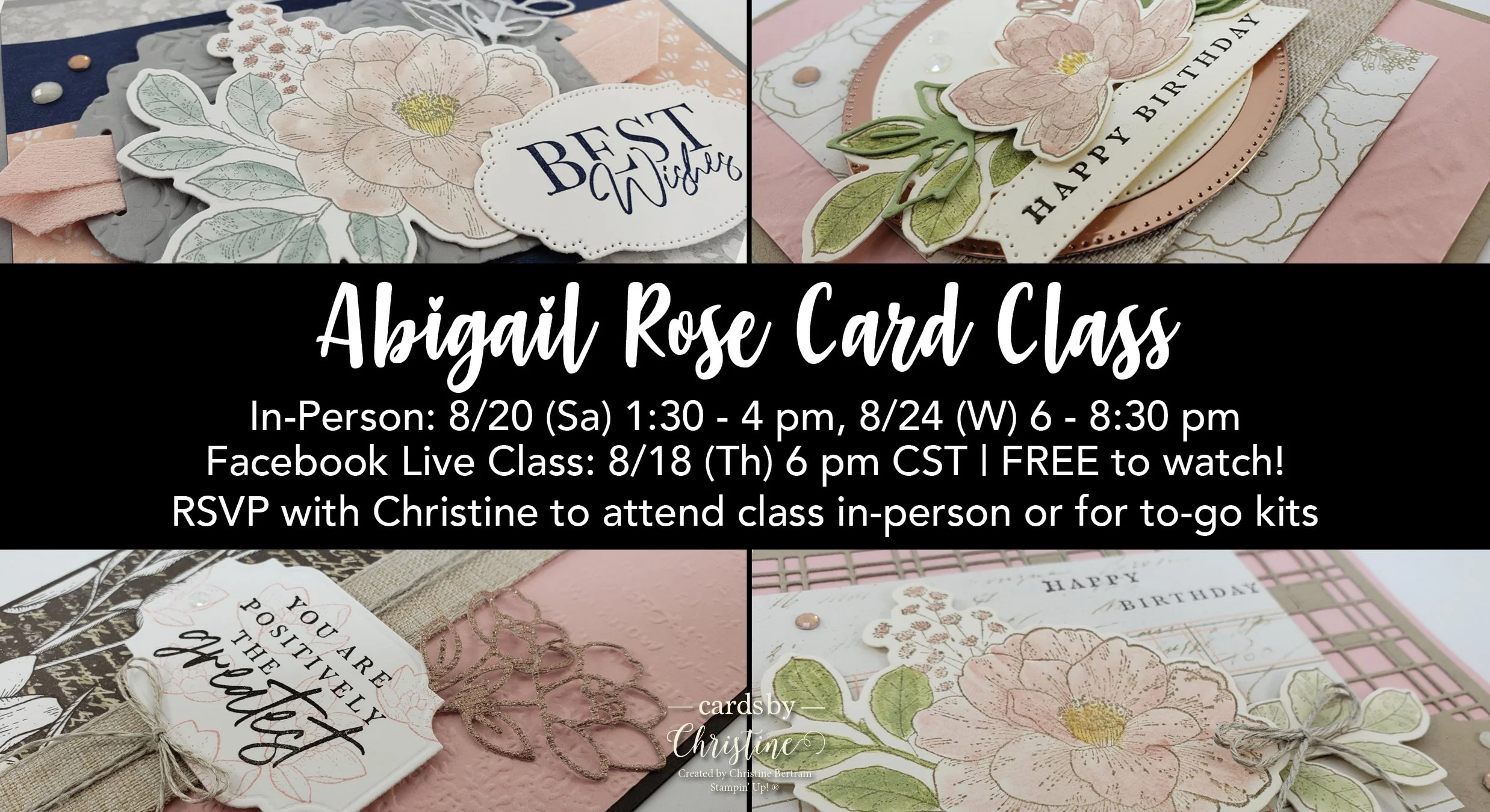 ***Abigail Rose Suite can be found in the Stampin’ Up! Annual Catalog on pages 56-57. Order the Cottage Rose Bundle by 8/12 ($53 + S&T) and attend any of the 3 classes for FREE plus receive a half pack of the Abigail Rose DSP (cut down to 6”x6” if mailed) value $6.00) for FREE The Bundle/Suite cannot be purchased as part of another class’ fee to receive the class and gift for FREE. Contact Christine after placing the order so it can be documented to send the gift with the kits or given at class. Must use the current host code found at cardsbychrisb.com to qualify.