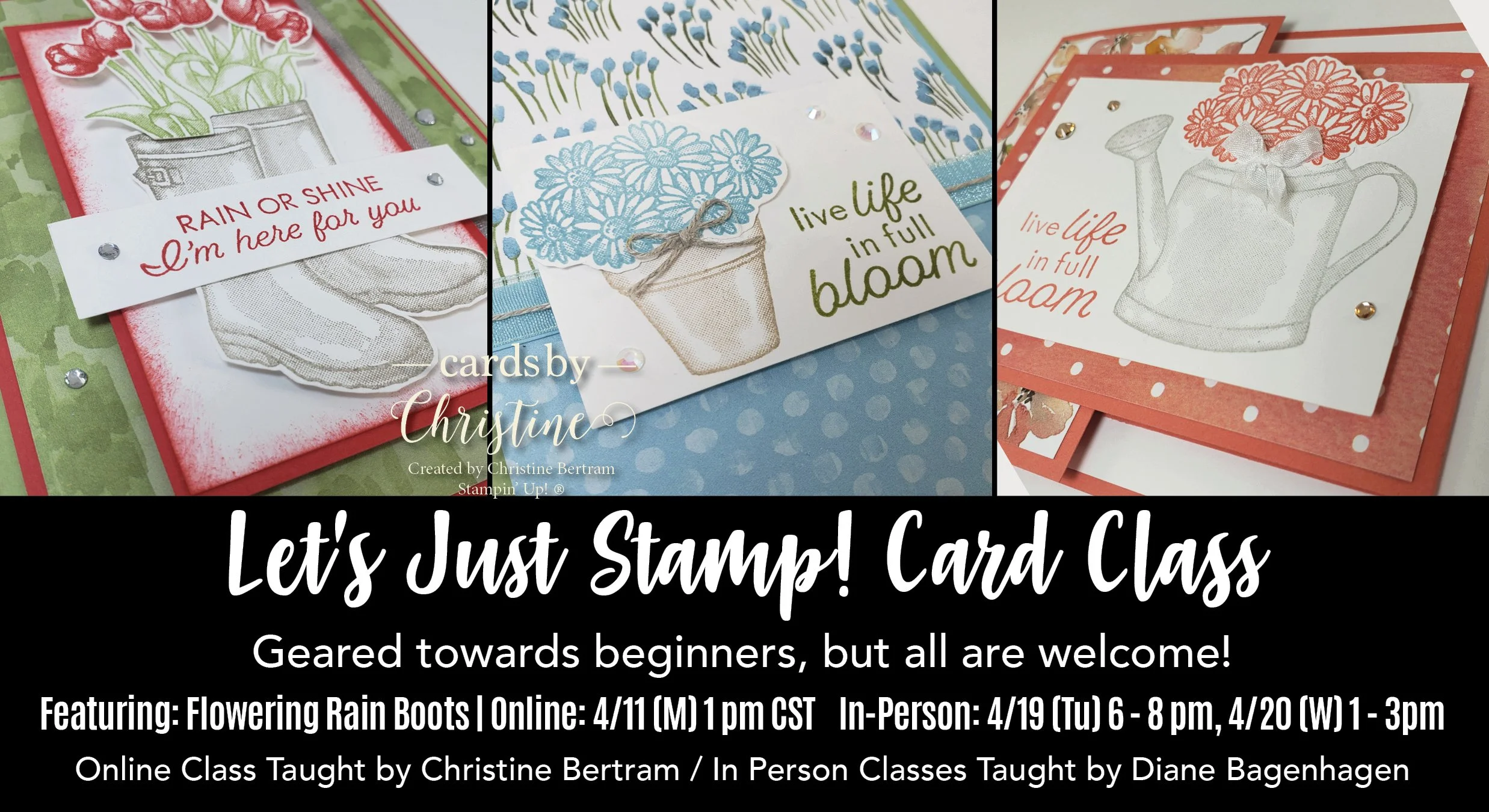 Register now for the Let’s Just Stamp! Card Class…….it's a card class geared towards beginner stampers, but all are welcome to join in the FUN! All you need to do is add stamps and ink. This class features the Flowering Rain Boots stamp set.