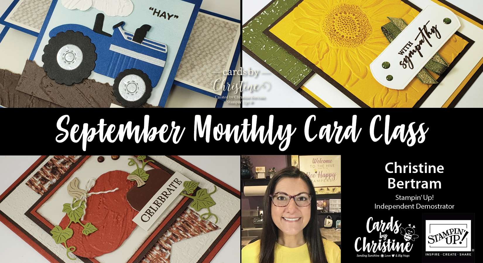 Check out the beautiful cards that are coming up in September! The sets featured are Tractor & Co, Beautiful Pumpkins, and the Sunflower embossing folder.