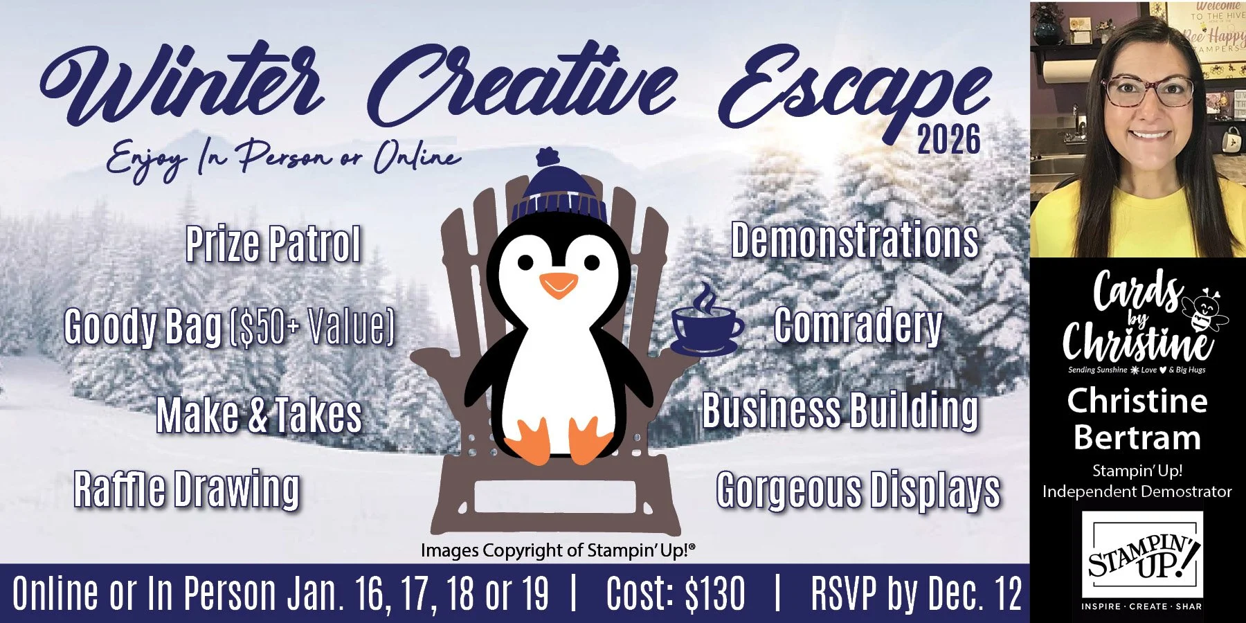 The Winter Creative Escape is an in-person/virtual convention packed with lots of stamping and learning. This event is guaranteed to get you ready to start the second half of the year strong which can lead to a great end of the Stampin’ Up year!